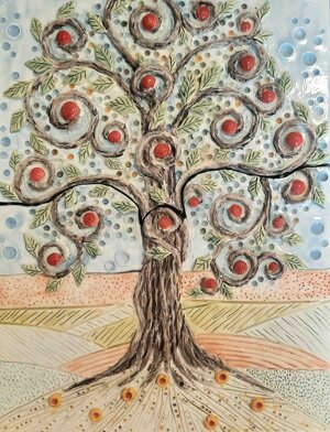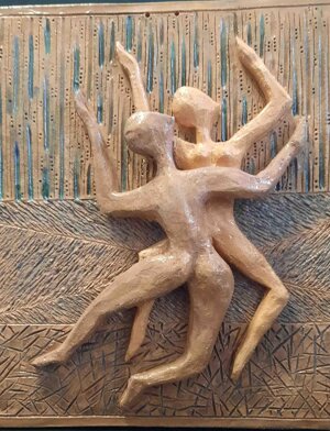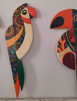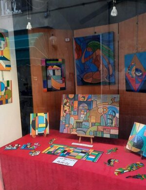I colori delle spezie orientali e dei tessuti del “suk” arabo vengono riflessi nei suoi lavori di bricolage e pittura. I colori della sabbia dei deserti e l’azzurro dei caldi mari mediorientali traspariscono dai suoi lavori.